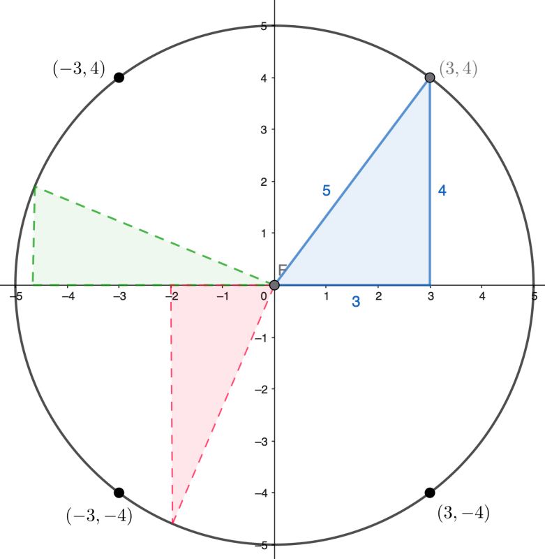 One corner of the triangle now lies on the circle. And because the two sides adjacent to the right angle have lengths 3 and 4, that point has coordinates $(3,4)$.