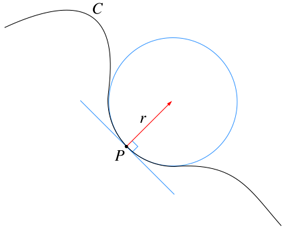 The curvature at a point is 1/r, where r is the radius of the tangent circle at the point.