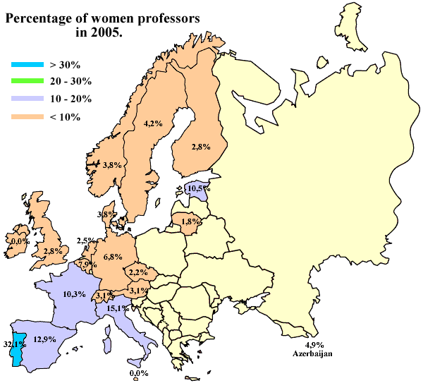 Percentage of female mathematics professors in 2005. From Statistics on women in mathematics, a report compiled by Catherine Hobbs and Esmyr Koomen. Click here to see larger image.