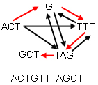 Suppose you have five chunks of the DNA sequence, each consisting of 3 letters, which you have to piece together to get the whole sequence. Each of the five chunks occurs in the entire sequence exactly once, and chunks overlap: in the whole sequence the last letter of one chunk is the first of another. For example, the two chunks AGT and TTG combine to AGTTG.
