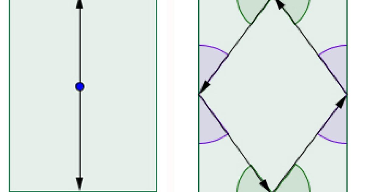 Left: if you shoot a ball so it meets the wall at right angles, it will bounce between opposite points on the table forever. Right: similarly, you can make the ball travel between four points. These are examples of periodic trajectories.