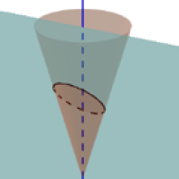 How are the two definitions of the conic sections connected? To find out, let's go back to the double cone. It turns out that you can find either one or two spheres that are tangent to (they just touch) both the double cone and the plane $P$ that defines the conic sections. These are called Dandelin spheres after the Belgian mathematician Germinal Pierre Dandelin who discovered them in 1822. Use the slider below to incline the plane $P$ (in turquoise) and see the corresponding conic sections and red Dandelin spheres. You get a parabola for the value $t=3.$ (See below for an explanation of the other objects appearing in this applet.)