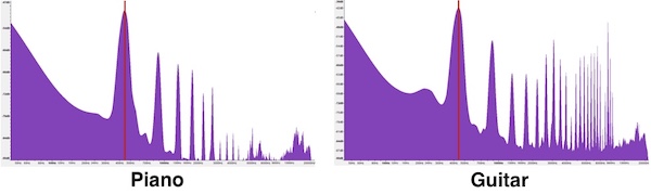 Here's an example of the harmonic frequencies produced by the note A4 on piano and acoustic guitar, which I produced on a piece of software called Audacity.