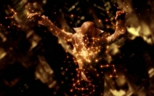 One recent example of responsive digital art on television was demonstrated within the music video to R.E.M.'s single Animal. A total eclipse of the Sun reveals to the lead singer, Michael Stipe, a whole hidden world of connections and energy lines lying beneath the reality that we are normally restricted to seeing. Figures walking around trail glowing auras, and as Stipe floats in the air singing, his body movements are picked out by the flickering of glowing stars, transiently linking together into constellations.