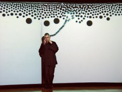 Messa di Voce is an audio-visual performance created by a team of four artists, some sections of which were later recreated as installations for the general public to experience directly. The title, Messa di Voce, is Italian for a vocal technique used by singers, meaning "placing the voice", and is very apt for the unbelievable vocal skills demonstrated by the performance artists here. The speech, singing, and other sound effects created by the two performers are used, along with a video camera following their movements around the stage, as input fed into custom digital art software which generates dynamic visualisations and projects them onto a screen. The stunning effect for the audience is of the artists' voices literally coming alive, the colourful sounds emanating away from their mouths in different magical ways.