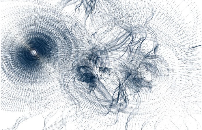 For a relatively simple computer program (using Processing), this digital art piece by LIA generates strikingly beautiful output. Click on the image above to follow a link to WithoutTitle, and use your mouse to interact with the animation. A dense thicket of lines swarm around the current position of your cursor, and moving around the screen affects how the lines expand and contract. See LIA's website for more information.