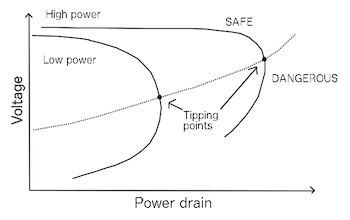 Each nose curve has, as we might expect, two solutions for a given value of Q before the tipping point. The upper part of the curve represents a stable solution (where slight variations in Q doesn't dramatically change the voltage) in the normal voltage range, which is where we want to operate the power grid. However as the reactive load Q increases a worrying sequence of events occurs. Firstly the supplied voltage starts to drop, and then we get to the tipping point there is no solution at all. What happens at this point is that the grid goes into a very unstable state during which the voltage collapses and all of the lights go out.