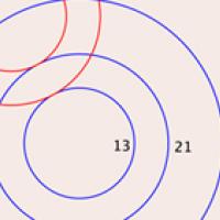 Since, as we know from the definition of the sequence, 34 - 13 = 21, the smaller red circle is tangent to the second smallest blue circle, which has radius 21. For the same reason, because 34 - 21 = 13, the larger red circle is tangent to the smallest blue circle, which has radius 13. Adding the radius of the smallest blue circle and the diameter of the larger red circle we get 13 + 2 x 21 = 13 + 21 + 21 = 34 + 21 = 55. Which is why the larger red circle is also tangent to the largest blue circle, which has radius 55. Thus, the outer boundaries of the girdle rings fit neatly between the smallest and the largest of the blue concentric circles.