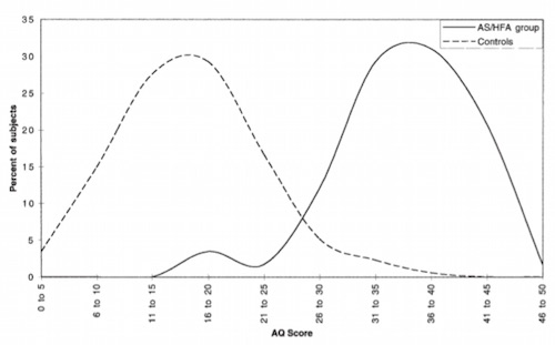 The ARC developed the autism-spectrum quotient (AQ) test to allow people to assess how many autistic traits they have. The bell curve on the right shows the distribution of AQ scores (which are out of 50) for people with a diagnosis of an ASC, compared to the curve on the left for a group of people without a diagnosis.