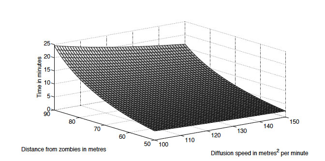Our diffusion model can tell us how long we have before zombies arrive. But mathematics can also be used to find strategies for slowing the rate of zombie infection, and even to answer the questions of whether it is possible to survive at all. (For those of you behind a very solid barricade with time to spare, you might like to read about these techniques in the upcoming book Mathematical Modelling of Zombies.)
