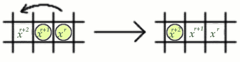 Let us examine what happens when a jump is made. \par If three squares are in a row, there are two possibilities. The first is that they are labelled $x^{r+2}, x^{r+1} ,x^r$, for some $r=0,1,2, \dots $. The second possibility is that they are labelled $x^{r+1}, x^r ,x^{r+1}$, for some $r=0,1,2, \dots $. \par Considering the first possibility, suppose three squares in a row or column are labelled $x^{r+2}, x^{r+1} ,x^r$, for $r=0,1,2, \dots $, with the first two squares occupied and the third vacant. When the peg in the first position jumps over the peg in the second position into the vacant third position