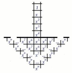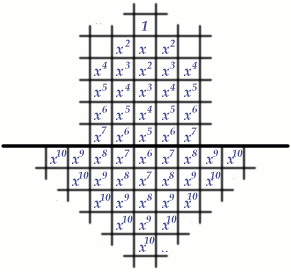 The value 1 is assigned to the target position in the fifth row, and the positions below that are assigned the values $x^r$, where $r$ is the smallest number of steps (horizontally or vertically) from that position to the target position.