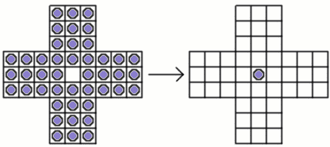 There are many versions of the game. In the best-known version the board is cross-shaped, with pegs in every position except the centre. The object is to find a jumping procedure which will leave just one peg in the centre.