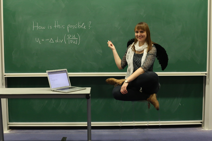 It's not supernatural powers that help Joana fly, but the equation on the blackboard. This partial differential equation can be used to fill in specific parts of an image based on what's around it. The process is called inpainting. For this image the equation was solved numerically to remove the stool Joana was sitting on. Image inpainting has wide ranging practical applications: from the restoration of satellite images, enhancement of medical images, the renovation of digital photographs and artwork, to special effects in images and videos.