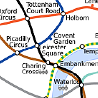 ![]() A piece of a geographically accurate map of the London Underground (top, image from Wikimedia commons) and the (roughly) corresponding piece of the network on the actual map (bottom). |