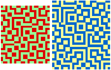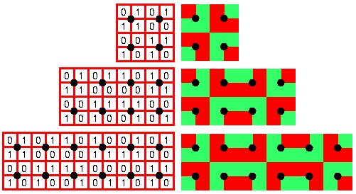 Examining the example described above, you can see that in each column and row the 0's and 1's are in balance. This implies also that the total number of 0's in the matrix is equal to the total number of 1's. This is a general property of a Liki-design: the two colours are in balance. As well as this global symmetry, there are local symmetries of two types: