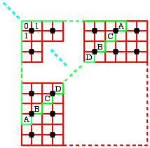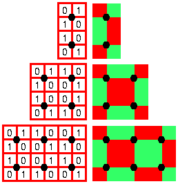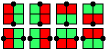 (2') Of the four unit squares between two arbitrary (vertical or horizontal) neighbouring grid points, two are red (=0), and two are green (=1) (this means that situations like the ones shown on the right are admitted too).