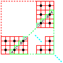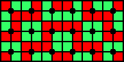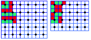 Observe pairs of horizontal or vertical neighbouring grid points in this example. What can be said about the distribution of red and green unit squares in the middle between the two grid points?