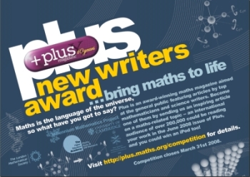 Another competition shortly closing is our very own Plus New Writers Award. Plus is again looking for the science writers of the future, who can make mathematics lively and interesting for a general audience Plus New Writers Award gives you (or your students) a chance to join our acclaimed list of authors, including physicist Stephen Hawking, mathematician and writer Marcus du Sautoy, and NASA astronaut Michael Foale. Whether you're young or old, a student or a teacher, a maths expert or an enthusiastic amateur, if you want to share your fascination with maths with the rest of the world, then this is a great way to give it a go.