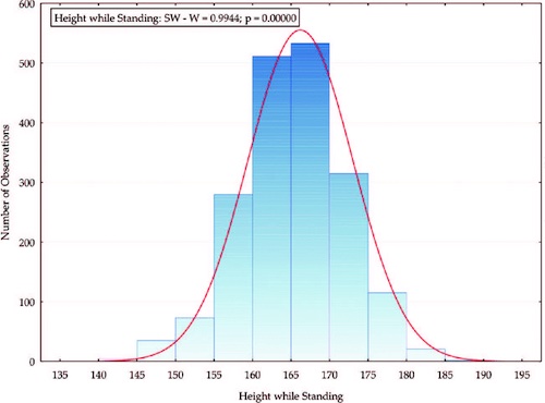 A histogram, showing how many people there are of each recorded height. (Figure from Hitka et. al. 2018 – CC BY 3.0)The mean, $\bar{x}$ , helps you locate the data. Another measure, called the variance, $v$, helps you quantify how spread out your data is. You can think of the variance is like the average of the squared distances for each observed value from the mean: $$ v = \frac{1}{n}((x_1-\bar{x})^2 + (x_2-\bar{x})^2 + \ldots + (x_n-\bar{x})^2). $$