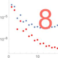 The remainder function RN corresponding to the asymptotic expansion of the gamma function, plotted against the number of terms N. Blue dots show the value of the remainder for x=2 and red dots for x=3. As you can see, in both cases the remainder decreases at first with the number of terms N, until it reaches a minimum value: truncating the expansion at this value of N gives you the best approximation to the function. The remainder then increases, so the approximation becomes less and less accurate.