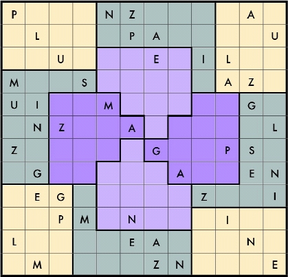 Each row, column, and jigsaw region must include exactly the letters you find in the words "Plus magazine", including repetitions. This means that each row, column, and region will contain the letter "a" twice.