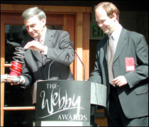 We won a Webby! At the Webby Awards - the Oscars for the internet - held last week, Plus magazine was officially named as the best science site on the web. The award, the leading international honour for web sites, was presented at a star-studded event at San Francisco's War Memorial Opera House by the International Academy of Digital Arts & Sciences, a diverse, 350-person organization whose membership includes musician Beck, Susan Sarandon, David Bowie, Francis Ford Coppola, and Julia Child. Dr Robert Hunt, Deputy Director of the Isaac Newton Institute at the University of Cambridge, England, and Editor of Plus, was in San Francisco to accept the trophy in person. Adhering to the Webby Awards' famous five-words-or-fewer speech limit, Dr Hunt said "Maths is elegant; interesting; useful." "This year's nominees and winners prove that the Web is alive and as dynamic as ever," said Tiffany Shlain, the founder and director of The Webby Awards. "We're incredibly proud to shine a spotlight on these stellar sites." Thousands of Web aficionados tuned in to watch the Webby action live on ABCNews.com's webcast of the event, which included a red carpet pre-show hosted by veteran US newscaster Sam Donaldson. After the awards ceremony, which was hosted by actor Alan Cumming, guests and winners rubbed elbows at the post-ceremony bash. Other winners included: