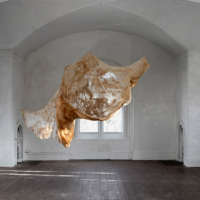 A description of the Aral Sea in Central Asia is usually written in the past tense. In the mid 1960s, it was one of the largest inland lakes in the world. Alas, now, due to Soviet irrigation projects, it has largely dried up into desert, leaving behind a skeleton scarred by sediment and salt, rippled by boundary layers and fluid mechanics, all of course governed by mathematics. The work was created with silk and cotton, intentionally chosen as both materials were grown with water that could have fed the Aral Sea. The piece is hung unevenly from the ceiling were light from nearby windows pierces it, making its randomness beautiful, its chaos candescent.