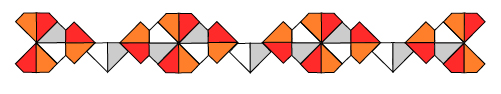 So, the answer for the triangular wrinkle is yes, while the answer for the hexagonal wrinkle is no. What happens with other regular polygons? A moment's reflection will show that a regular polygon will produce one of these sliding tilings only when its angle divides exactly into 180. Or, $$\frac{180}{180-\frac{360}{n}}$$ must be a whole number. Moving around this expression as before, we can see that the viability of the sliding tiling using one regular polygon, goes hand in hand with the condition that $$\frac{n}{n-2} = 1 + \frac{2}{n-2}$$ must be a whole number. But $\frac{2}{n-2}$ is a whole number only for $n = 3, 4.$ In other words, only equilateral triangles and squares can produce this kind of sliding tiling using just one regular polygon.
