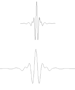 This is an example of two versions of a wavelet. A squashed version of the wavelet (above) has a higher frequency than the original version (below).
